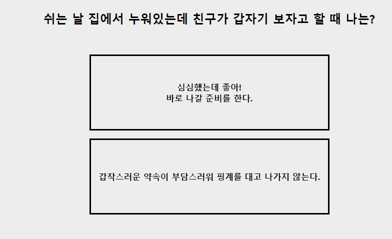 저는 " 주말 중에 적어도 하루는 쉬어야 하는데.. 어떡하지..?"로 선택하겠습니다.